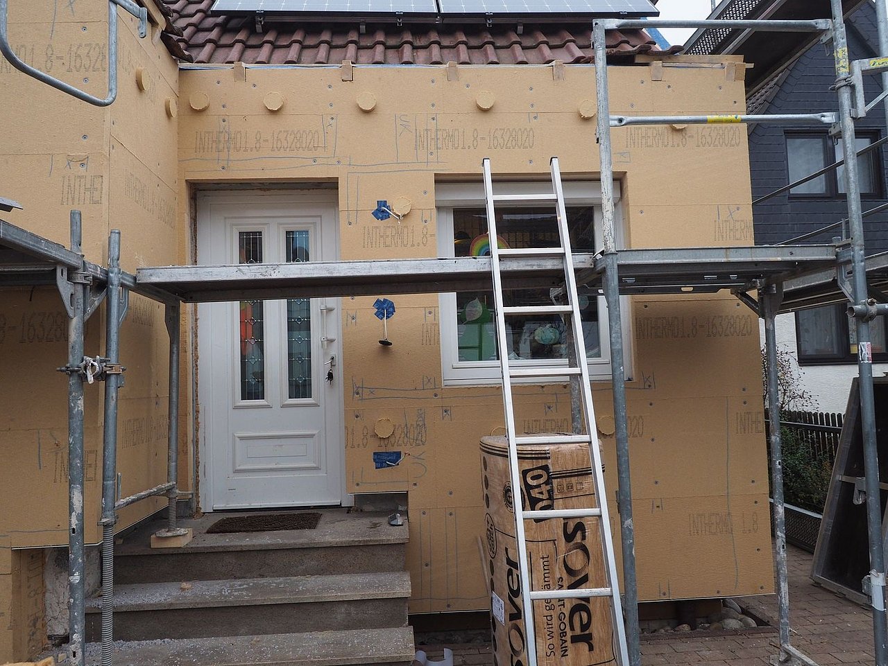 Die Sanierung begann mit der Installation einer Photovoltaikanlage mit einer Leistung von 8,5 kWp. Dies war zu Beginn (2019) ein wichtiger Beitrag zur Reduktion des ökologischen Fußabdrucks des Hauses. Die Anlage ermöglicht selbst ohne elektrischen Speicher auch nach Installation der Wärmepumpe eine Autarkie von ca. 40 Prozent. Der Stromverbrauch (Haushalt und Wärmepumpe) betrug in 2023 4100 kWh. Davon waren 1650 kWh Eigenverbrauch des lokal erzeugten Stroms. Weitere 6.650 kWh wurden ins Netz eingespeist. Nahezu zeitgleich erfolgte die Dämmung der obersten Geschossdecke. Etwa 20 cm Zelluloseflocken (Recyclingprodukt) wurden in Eigenleistung aufgebracht, was den Heizenergiebedarf und den Wohnkomfort im Obergeschoss erheblich verbesserte. Die Maßnahme amortisierte sich finanziell bereits nach einem Jahr.