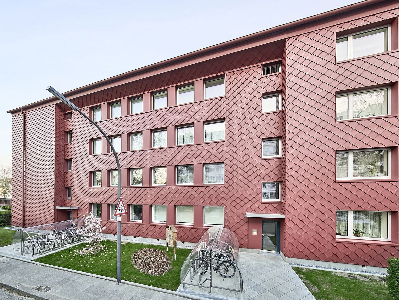 Die attraktive Fassade mit einer Verkleidung aus kleinteiligen Aluminiumrauten stellte ebenfalls eine Herausforderung dar. Technisch bedingt erfolgt deren Verlegung vor Ort auf der Baustelle. Da dies sehr arbeitsintensiv ist, erarbeiten die Architekten zusammen mit dem Hersteller eine Lösung, bei der die Rauten bereits werkseitig auf die Fassadenelemente aufgebracht werden können.