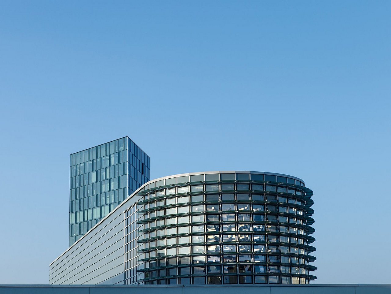 Fassade: Fläche: 8.500 m², 3-fach-Isolierverglasung; U-Wert: 1,3 W/m²; Gesamtenergiedurchlass (Sommer): min. 20 %; iIndividuell und nutzerabhängig steuerbare Blendschutzbehänge