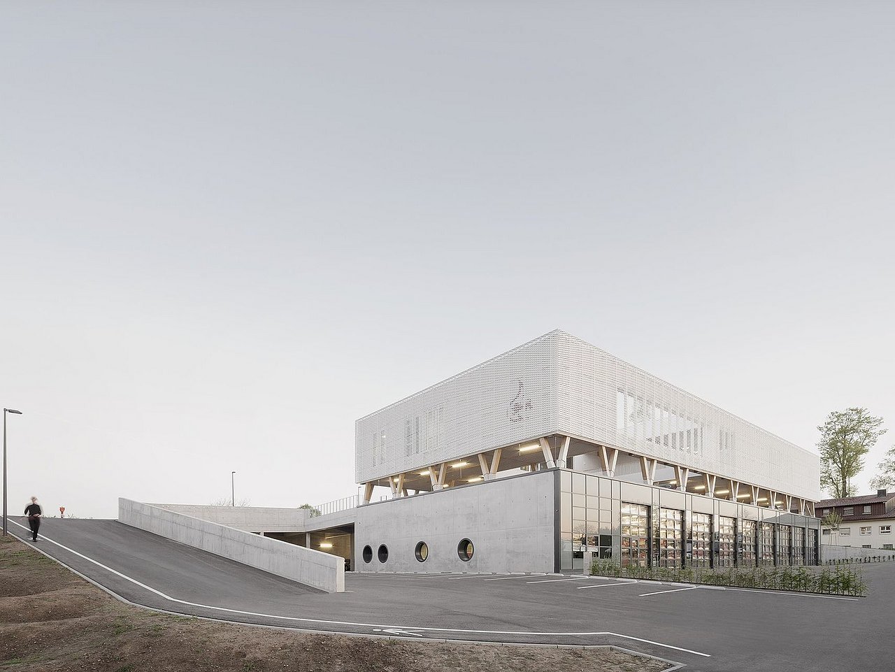 Das sich nach Norden zur Straße öffnende Sockelgeschoss ist in den Hang eingefügt und entsprechend massiv in Stahlbeton ausgeführt. Die Ebene nimmt die Löschfahrzeughalle sowie alle für den Einsatz notwendigen Funktionen samt Lager- und Technikflächen auf. In einer nächsten Ebene trennt ein offenes Zwischengeschoss mit zwei Lichthöfen und Parkflächen beziehungsweise Raum für Veranstaltungen oder Aufenthalt auch optisch die vertikale Schichtung. Markante V-Stützen kennzeichnen diese funktionale Trennung. Die Flächen der Zwischenebene, die auch mögliche Erweiterungen bei erhöhtem Raumbedarf generieren können, werden über eine außenliegende Rampe erschlossen. Schließlich bietet ein aufgeständerter Holzbaukörper mit einer Fassade aus weißem Streckmetall Platz für einen Schulungsraum, Büroflächen sowie weitere, gemeinschaftlich genutzte Räume.