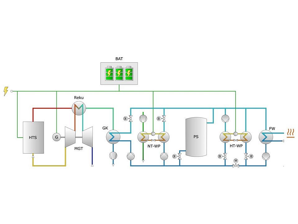 Für Strom und Wärme: Hochtemperaturspeicher bzw. Carnot-Batterie (10,5 MWh bei 1200°C; 600 kW el. Heizung) mit Rückverstromung (30 kWel; 80 kWth)