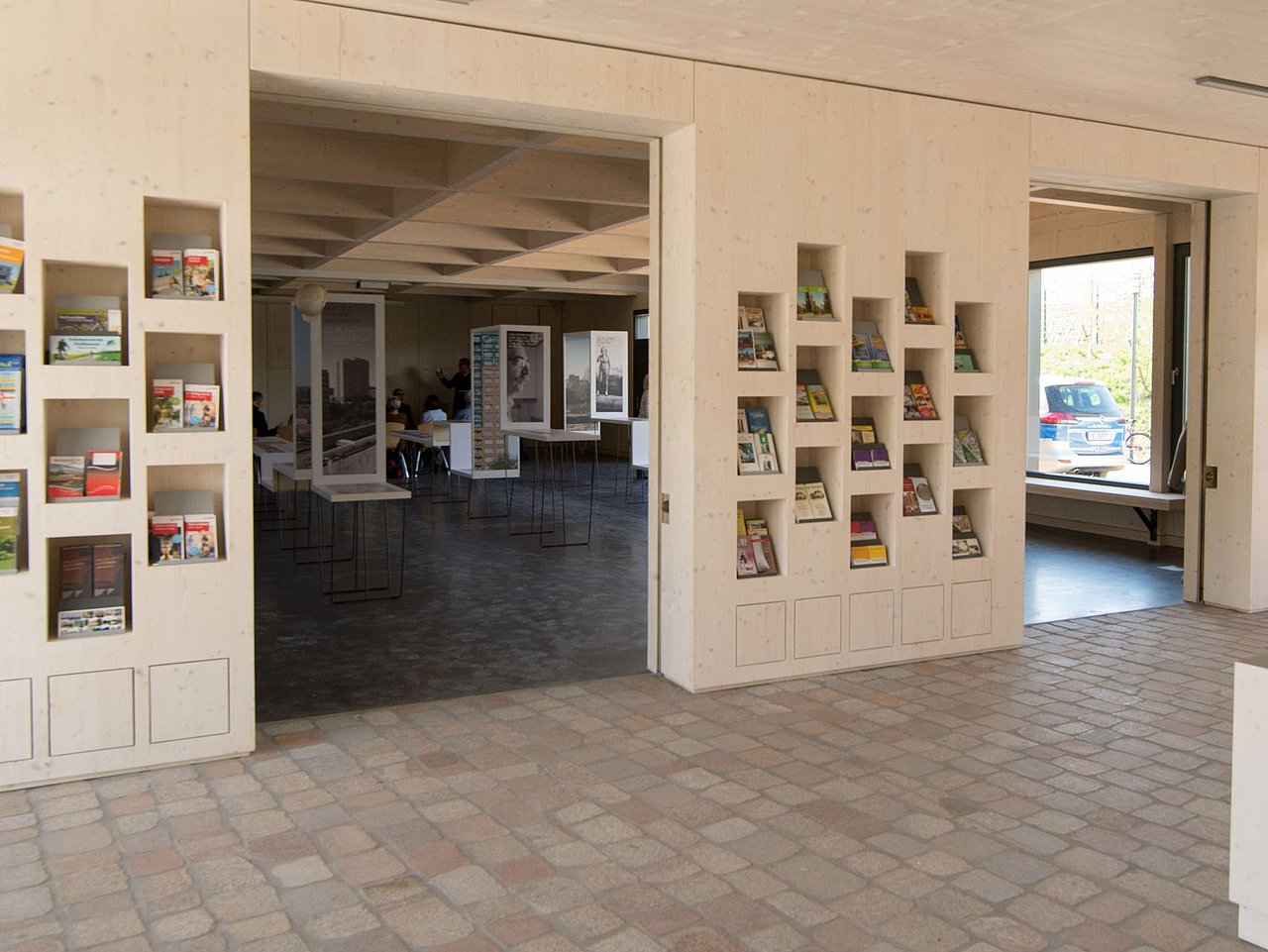 Die Touristeninformation bildet das Zentrum, fungiert als Eingang, Foyer und bildet eine Achse zwischen Straße und Park.
