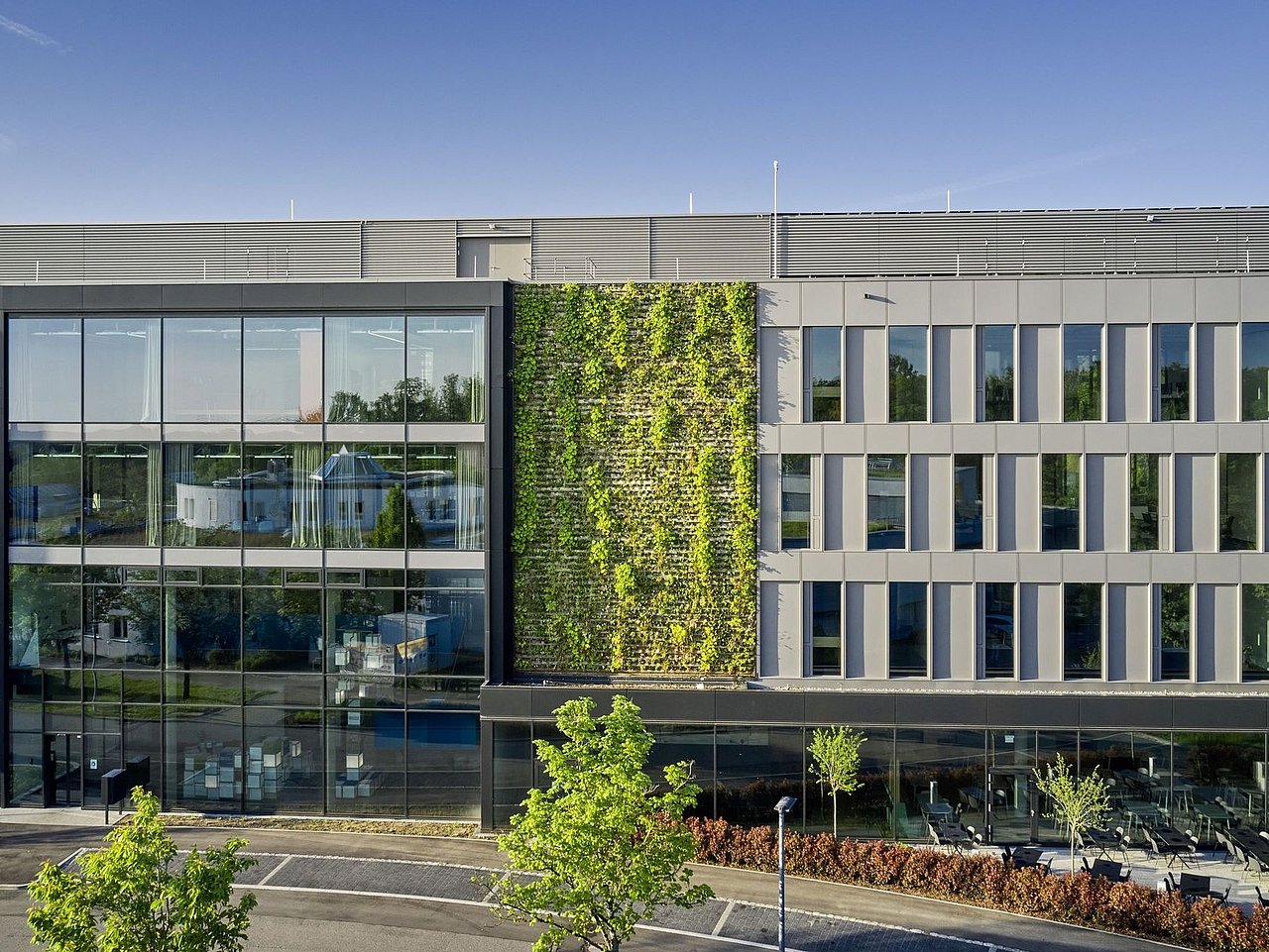 Für die vertikale Begrünung der Nordfassade hat die Firma Vertiko mit ihrem Bauherrn ein Konzept mit elf verschiedenen Pflanzen und sechs verschiedenen Farben erarbeitet. Dieses sorgt während des gesamten Jahres für eine abwechslungsreiche Fassade. Die Pflanzen (darunter der China-Wald-Geißbart, die Bergenie Oeschberg oder das Purpurglöckchen) wachsen in einem Behältnis mit Substrat, das direkt an die Fassade angebracht wurde. Um den Brandschutzanforderungen zu genügen, setzte der Dienstleister ein Spezialvlies aus einem Basalt-Glas-Gemisch ein, das nicht brennbar ist. Das Wasser im Behältnis kühlt die Fassade zudem derart, dass die Temperaturen im Hinterlüftungsraum weit unter den Werten einer reinen Metallfassade liegen.