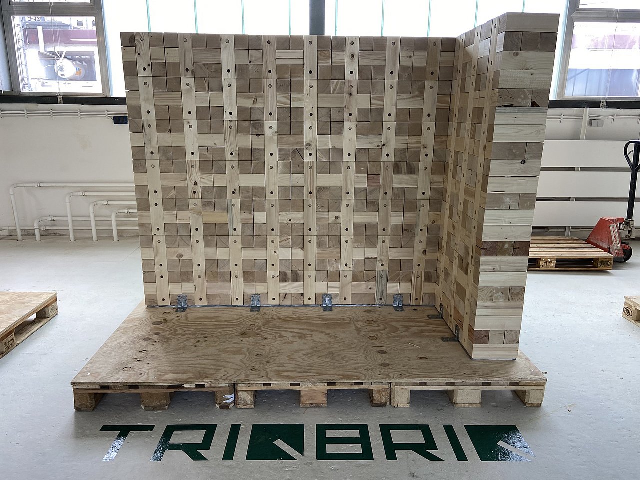 Im Juli 2023 wurde der 430 Quadratmeter große Rohbau des ersten mehrstöckigen Wohngebäudes mit prämiertem TRIQBRIQ-System in sechs Arbeitstagen fertiggestellt. Dank zirkulärem Massivholz-Bausystem auf Basis von Schad-, Schwach- und rückläufigem Bauholz können rund 50.000 Kilogramm CO2 im Rohbau eingelagert werden.