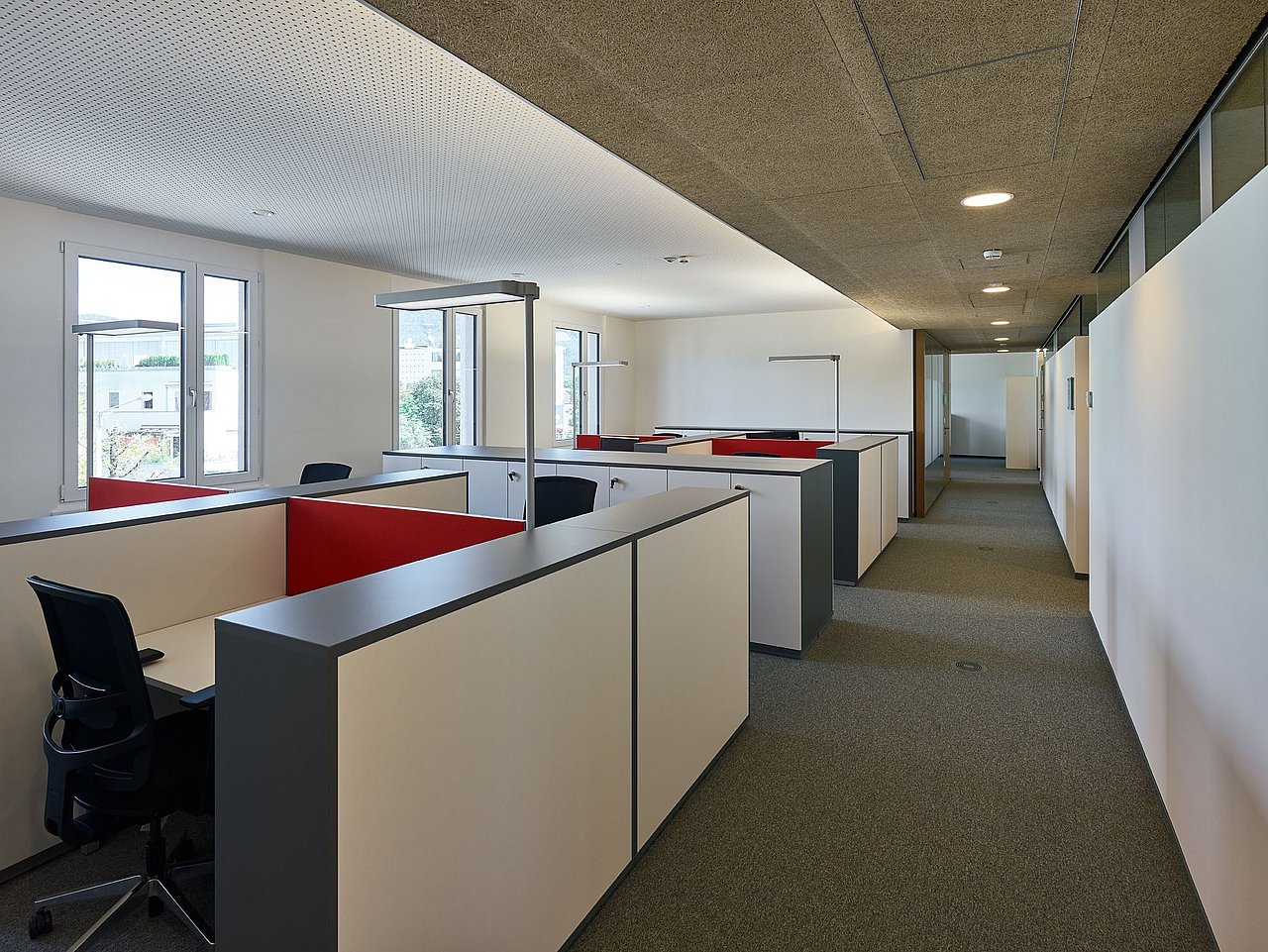 Bei der Planung des Verwaltungsgebäudes lag ein weiterer Fokus auf einer suffizienten Bauweise. Die Grundrisse und Fassaden sind nicht nur zweckmäßig mit Blick auf die Nutzung als Bürogebäude geplant. Um je nach Bedarf die Räume flexibel einteilen zu können, tragen nur der massive Gebäudekern und die Außenwände die statischen Lasten. Durch den Verzicht auf tragende Innenwände entstand die flexible Grundrissstruktur, die eine langfristige Nutzung ohne aufwendige Umbauten gewährleistet.