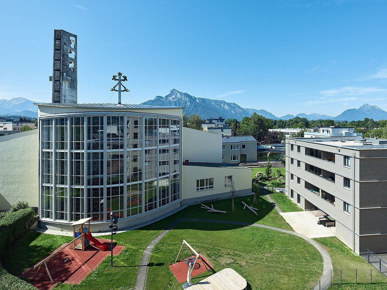 Zum 100. Caritas-Geburtstag bekam die katholische Hilfsorganisation ein neues Gebäude in Salzburg-Herrnau. Dank des neuen Verwaltungsbaus mit Büroflächen für rund 100 Mitarbeitende und einem Second-Hand-Shop der Caritas befinden sich nun wesentliche Bereiche der Caritas auf einem Grundstück, die bis dahin über die gesamte Stadt Salzburg verteilt waren. Noch dazu sind sie barrierefrei. Gemeinsam mit dem zweiten Neubau – dem Gebäude der Pfarre Salzburg-Herrnau mit einem Kindergarten und zehn Wohnungen für Bedürftige – bildet der Caritas-Neubau eine Art Pforte zum ehemaligen Klostergarten.