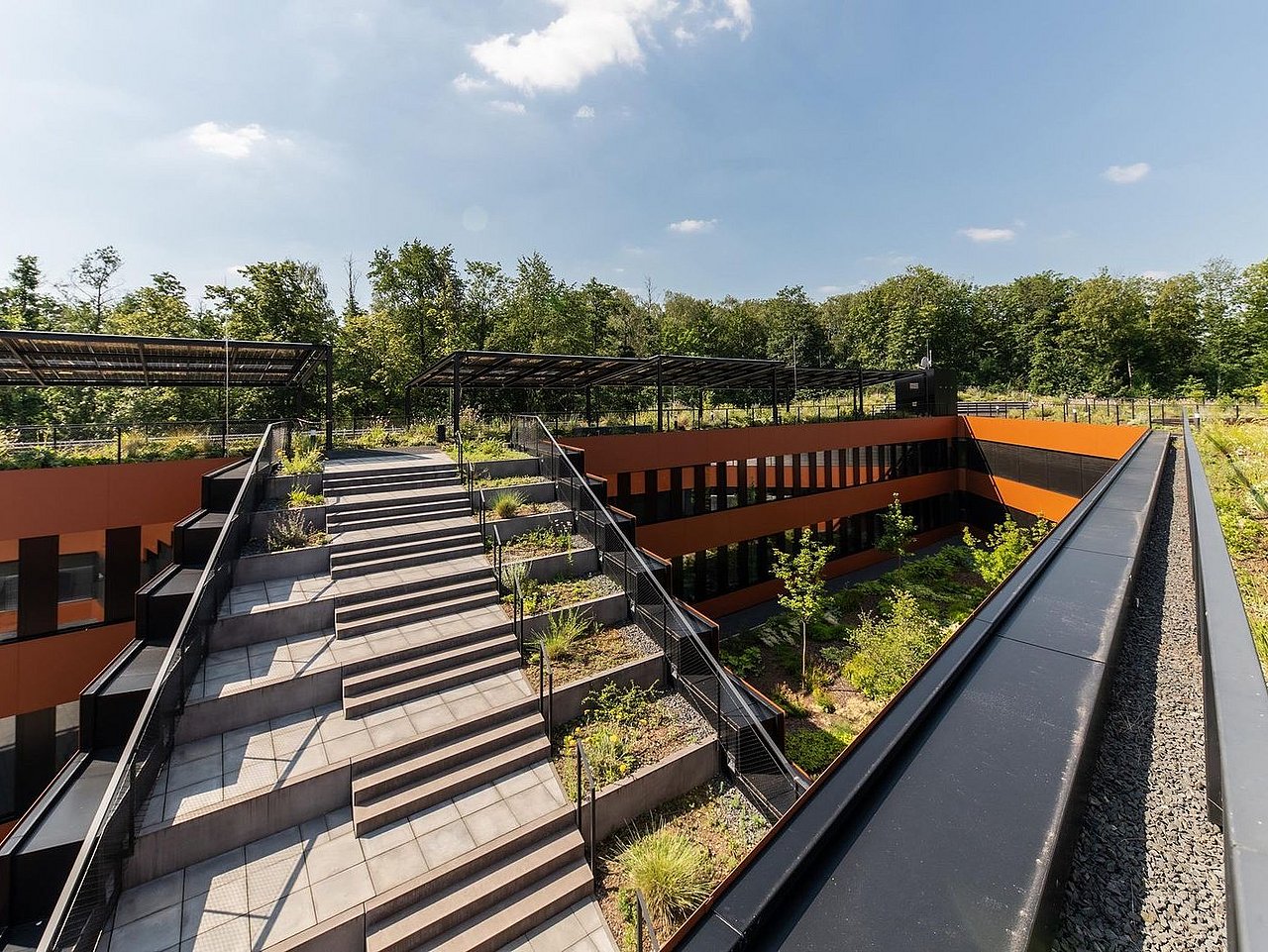 Für die Mitarbeitenden präsentiert sich das Verwaltungsgebäude als ein ästhetisch ansprechendes Arbeitsumfeld, das ökologische Mehrwerte gleichzeitig funktional nutzt. So dient das intensiv begrünte Dach nicht nur der Biodiversität und bietet eine hohe Retentionsfähigkeit, sondern es sorgt auch für hohe Nutzungs- und Erholungsqualität. Die installierten PV-Anlagen sind so konzipiert, dass sie hoch aufgeständert als Pergola dienen und so im Sommer einen angenehmen Schattenwurf für die Aufenthaltsbereiche bieten.