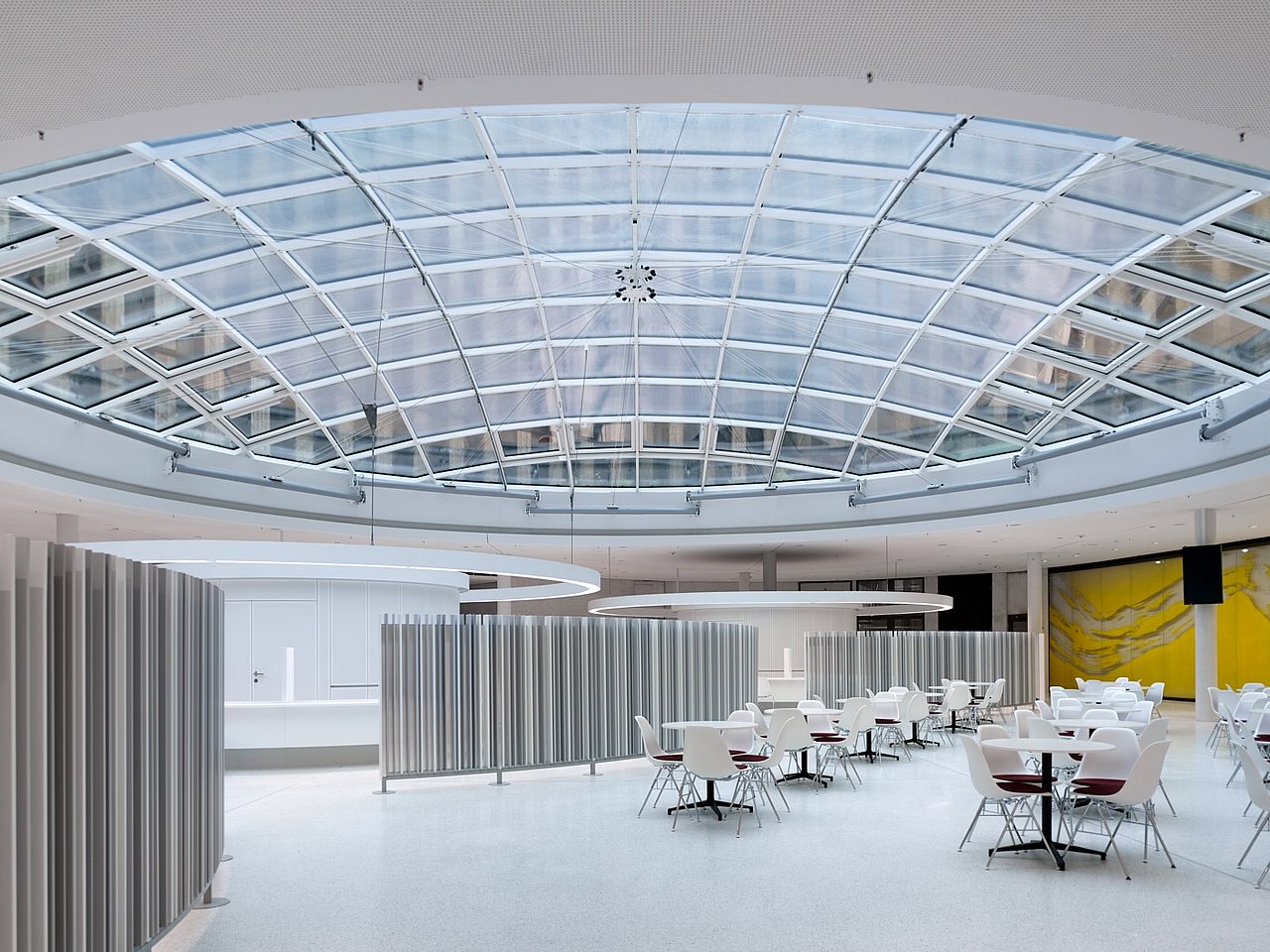 In den öffentlichen Zonen wie dem Bürgerservicezentrum, Restaurant und Konferenzräumen erfüllt ein Heiz- und Kühldeckensystem, ergänzt durch eine Teilklimaanlage mit hocheffizienter Wärmerückgewinnung, die spezifischen Bedürfnisse dieser Bereiche. Die Kühlung nutzt vorrangig Umweltenergie, gewonnen aus einem Grundwasserbrunnen. Die nötige Hochtemperatur-Wärme, besonders für die Kantine und sanitären Einrichtungen, wird durch einen solarthermisch unterstützten Gaskessel bereitgestellt.