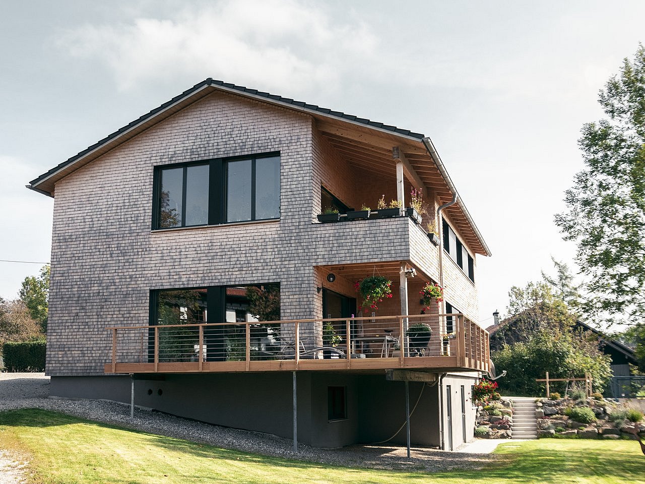 Ein hochwertiges, zertifiziertes Passivhaus für zwei Familien wurde in Weitnau mit einem minimierten Energiebedarf für Wärme und Strom und der Nutzung der Synergien des "Miteinander Bauen" umgesetzt. Die Bauherren legten Wert auf eine vollständige regenerative Energieversorgung, die durch die lokale Energiegenossenschaft möglich war: Sie versorgt die Bewohnerinnen und Bewohner des Hauses über eine Nahwärmeleitung zu 100 Prozent mit Biomasse (Biogas und Hackschnitzel).