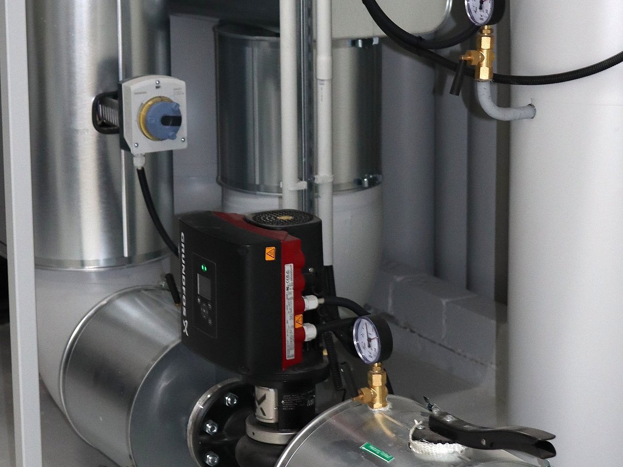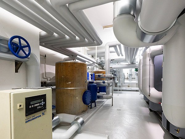 Die Nutzung von Abwärme bringt dabei spezifische technische Anforderungen mit sich. Das niedrige Temperaturniveau von 27 °C muss durch zwei Wasser-/Wasser-Wärmepumpen mit einer Gesamtleistung von 1.600 kW auf rund 70 bis 75 °C angehoben werden. Die Wärmepumpen stehen auf dem Gelände des Rechenzentrums. Durch ein etwa 140 Meter langes Wärmenetz gelangt die Wärme durch eine hydraulische Einbindung in das vorhandene Heizsystem des Pallasseums. Herausforderung waren hier die Schaffung einer innenliegenden Rohrleitungstrasse bei engen Raumverhältnissen. Für die Versorgungssicherheit und Spitzenlastabdeckung ergänzt ein neuer hocheffizienter Erdgas-Brennwertkessel im Wohngebäude die Wärmeerzeugung.