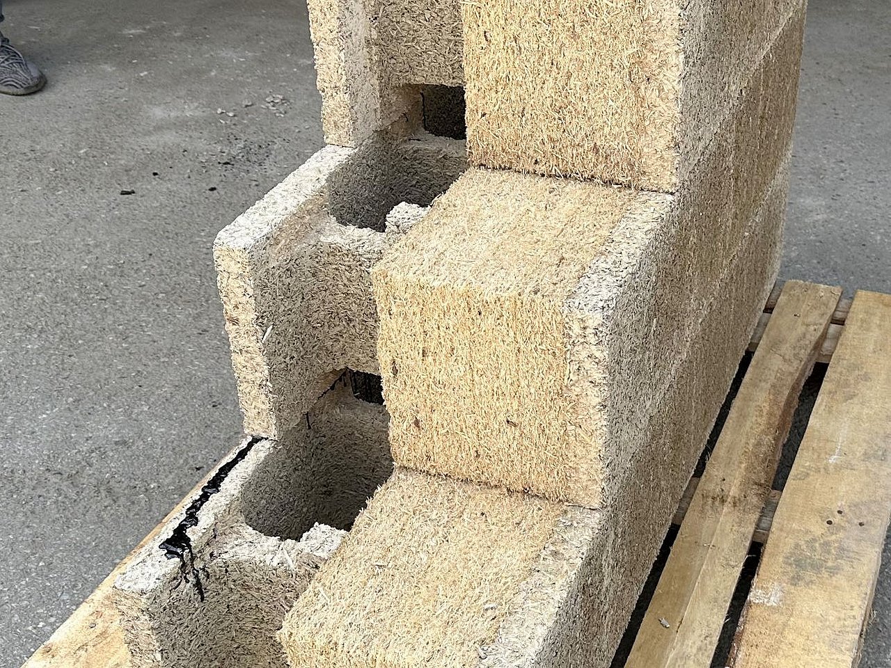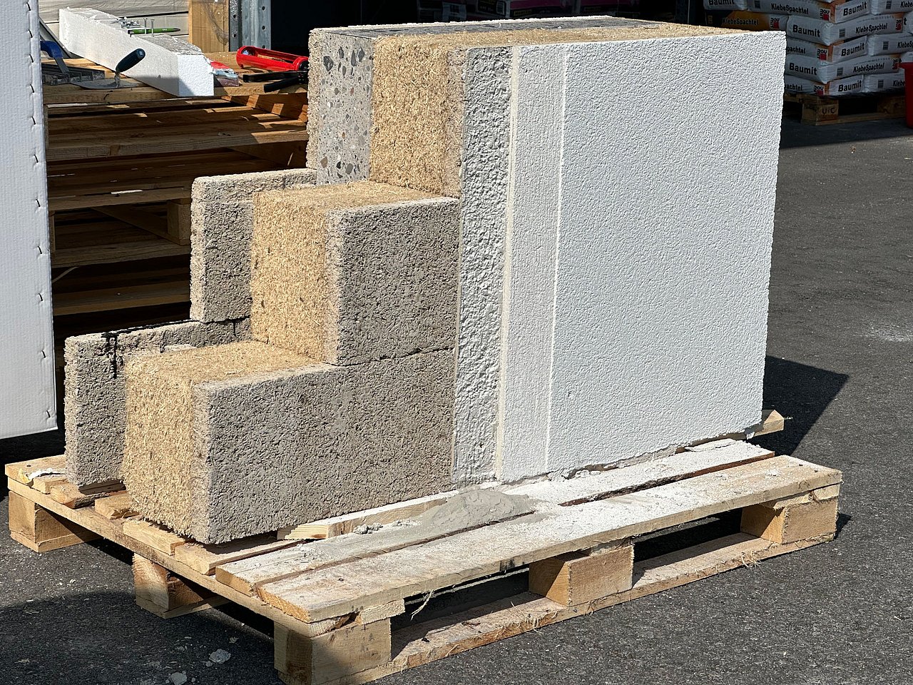 Denn besonders beim Rückbau von Gebäuden fallen Materialien wie Beton, Holz und weitere Baustoffe an, die durch Aufbereitung wiederverwendet werden können. Der zentrale Bestandteil des wiederverwertbaren Wandaufbaus ist daher ein Holzbeton-Mantelstein. Der recycelte Betonkern des Mantelsteins wird unter Einsatz eines neuen CO2-reduzierten Verfahrens als „Green Tech Zement" produziert. Hinzu kommen eine aus Grünschnittfasern gepresste Dämmplatte und ein voll mineralischer Drei-Lagen-Putz auf Basis von Kalk. Im Ergebnis entsteht ein international bewährter Wandaufbau aus recycelten und regionalen Materialien, dessen Komponenten wiederverwertbar sind.