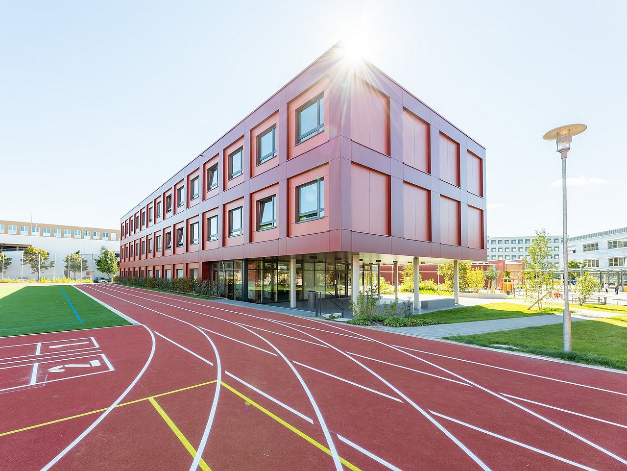 Der Erweiterungsbau der Astrid-Lindgren-Grundschule wurde auf dem Schulgelände in direkter Nachbarschaft zu den Bestandsgebäuden von Schule und Kita erstellt. Er ist als dreigeschossiger Riegel aus vorgefertigten Modulen ausgeführt und nimmt die Fluchten der Kita auf, um sich harmonisch zu integrieren. Alle Räume sind mit einer kontrollierten Be- und Entlüftung ausgestattet. Die Beheizung erfolgt über Fernwärme, die mit wirtschaftlichen Plattenheizkörpern in die Räume übertragen wird. Die wärmegedämmte Fassade besteht aus einer hinterlüfteten, mineralisch gedämmten Vorhangfassade aus HPL-Platten (High Pressure Laminate). Auch das Flachdach trägt zum Klimaschutz bei: Ein Gründach sorgt für den ökologischen Ausgleich der versiegelten Grundstücksfläche. Darüber hinaus verbessert es die Dämmwirkung gegen winterliche Kälte und sommerliche Hitze und filtert Luftschadstoffe sowie Feinstaub aus der Luft.