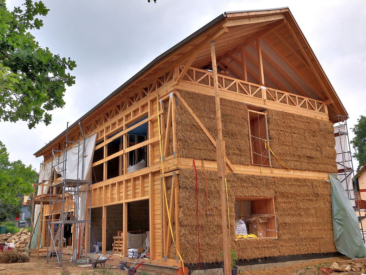 Es ist längst auch in europäischen Ländern wie Frankreich, Spanien, Österreich und der Schweiz etabliert. Während man dort jedoch Strohballenhäuser ohne großen bürokratischen Aufwand errichten kann, braucht man in Deutschland – das war die nächste Herausforderung – eine Einzelfallgenehmigung. Mehr Vorlaufzeit in der Planung war nötig. Die Einzelfallgenehmigung wurde den Bauherren in Weimar schließlich im Jahr 2017 erteilt, und zwar für ein reines lastabtragendes Strohballenhaus mit zwei Geschossen.