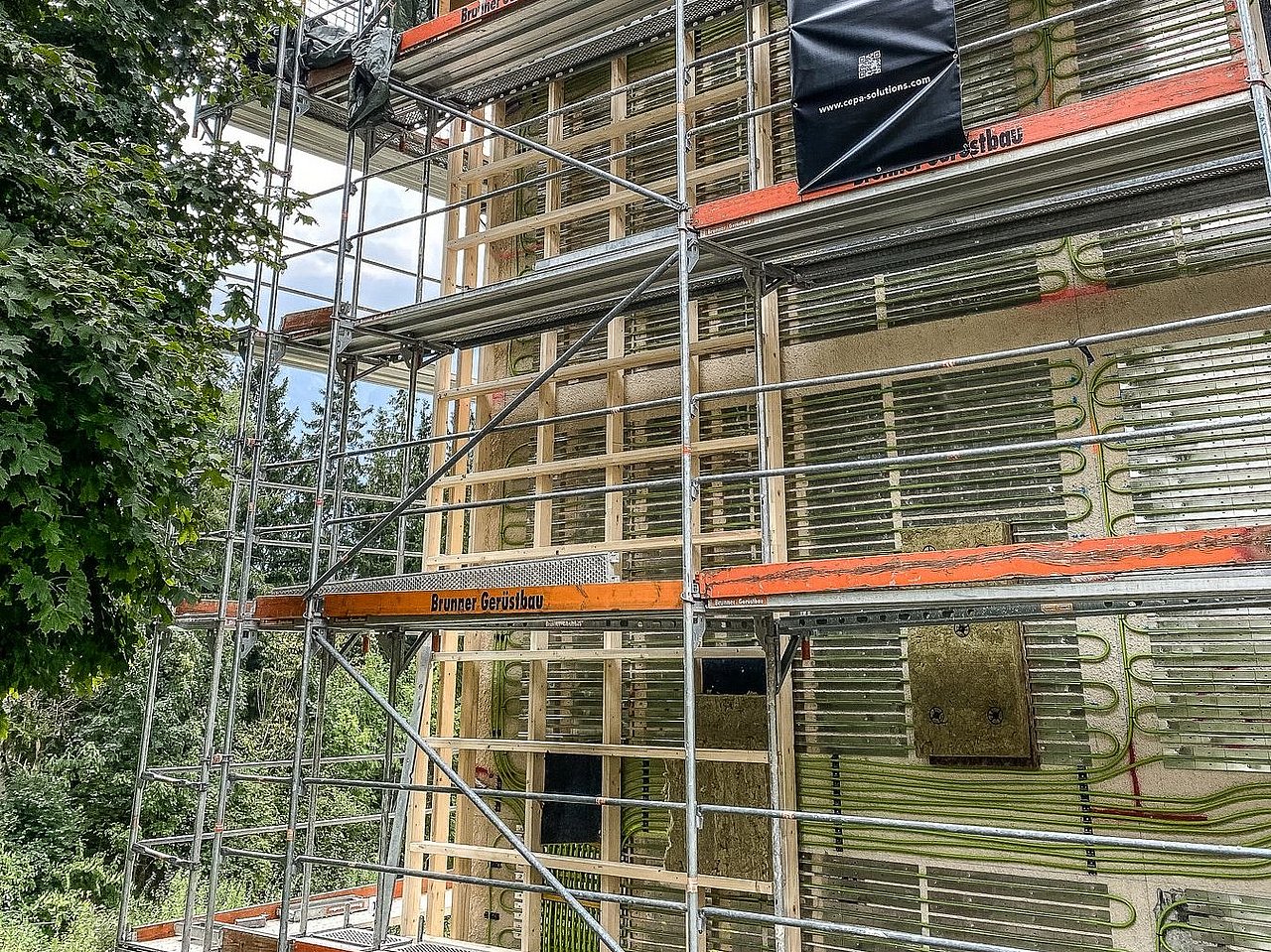 Eine Photovoltaikanlage auf den Dächern unterstützt die Energieversorgung und erzielt eine Jahresenergieausbeute von 27.453 kWh (SüdSan 1) bzw. 16.833 kWh (SüdSan 2). Energietechnisch wurden zentrale Lüftungsanlagen mit Wärmerückgewinnung installiert, die die Luftqualität erheblich verbessern und Lüftungswärmeverluste minimieren. Die Wärmeversorgung erfolgt durch Wärmepumpen: eine Sole-Wärmepumpe im kleineren und eine Luft-Wärmepumpe im größeren Gebäude. Für eine effiziente Wärmeverteilung bei niedrigen Temperaturen sorgen im kleineren Gebäude neu installierte Heizkörper, die von der Außenwand angefahren werden. Im größeren Gebäude kommt eine CEPA®-Energiefassade zum Einsatz. Dieses neuartige System kombiniert Dämmung, Heizen und Kühlen in einer Lösung. Die thermische Aktivierung der Außenwand erfolgt durch hydraulische Heizschlangen, die auf der Außenseite der Wände angebracht und mit einer hochdämmenden Schicht überdeckt werden. Das System bietet erhebliche Vorteile, da es ohne Eingriffe in die Innenräume installiert werden kann und daher auch für Sanierungen im bewohnten Zustand geeignet ist. Durch die großen Wärmeübertragungsflächen arbeitet das System mit niedrigen Vorlauftemperaturen, was eine besonders effiziente Nutzung erneuerbarer Energien ermöglicht. So trägt die CEPA®-Energiefassade zur Reduzierung von Energieverbrauch und CO₂-Emissionen bei.