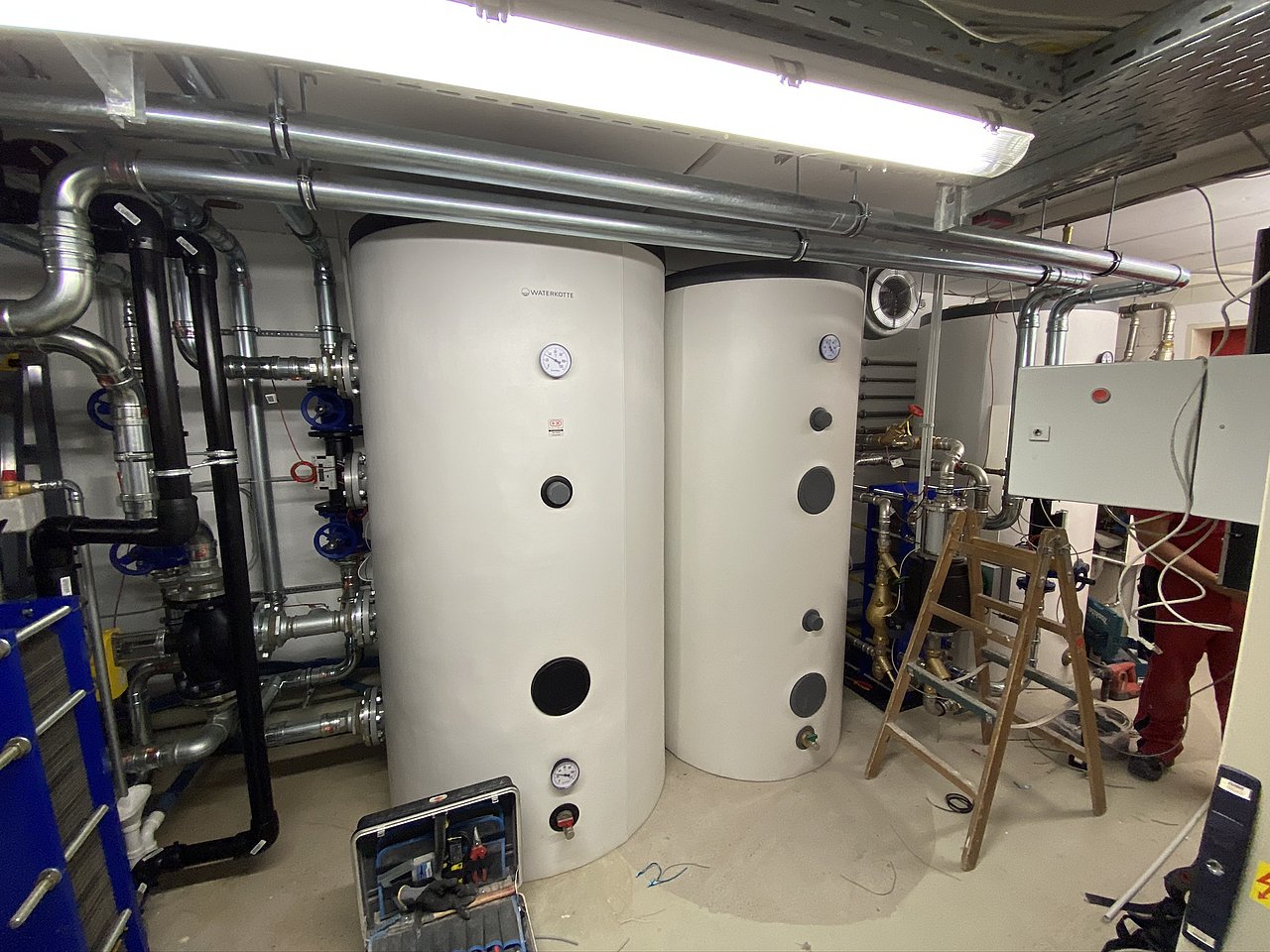 Das neue Anlagensystem besteht aus zwei Wärmepumpen: Eine Niedertemperatur-Wärmepumpeübernimmt die Beheizung des Gebäudes. Die Hochtemperatur-Wärmepumpe erwärmt das Trinkwarmwasser. Als Wärmequelle wird das Grundwasser über einen Saug- und Schluckbrunnen genutzt. Zusätzlich werden zwei zentrale TWW-Speicher und ein Heizungspufferspeicher mit je 900 Liter Fassungsvermögen eingesetzt.