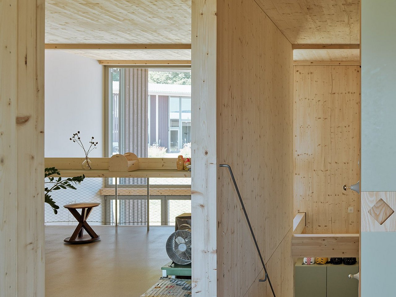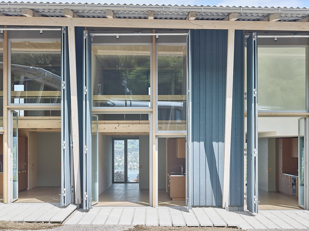 Der Verzicht auf eine Tiefgarage und die nur geringfügige Unterkellerung bedingte eine hohe Einsparung an Beton und Grauer Energie. Stattdessen fußen die Wohngebäude lediglich auf Kufen aus Beton, die die Leichtbaukonstruktion in Holztafelbauweise verankern. Die mit Wellblech gedeckten Dächer, bunte Holzfassaden und -scheunentore vor den verglasten Fronten vermitteln Leichtigkeit und eine an den ländlichen Kontext angepasste Typologie. Auf langfristige Nutzung ausgelegt, sind die Bauwerke auch rückbaufähig oder an zukünftige Bedürfnisse anpassbar.