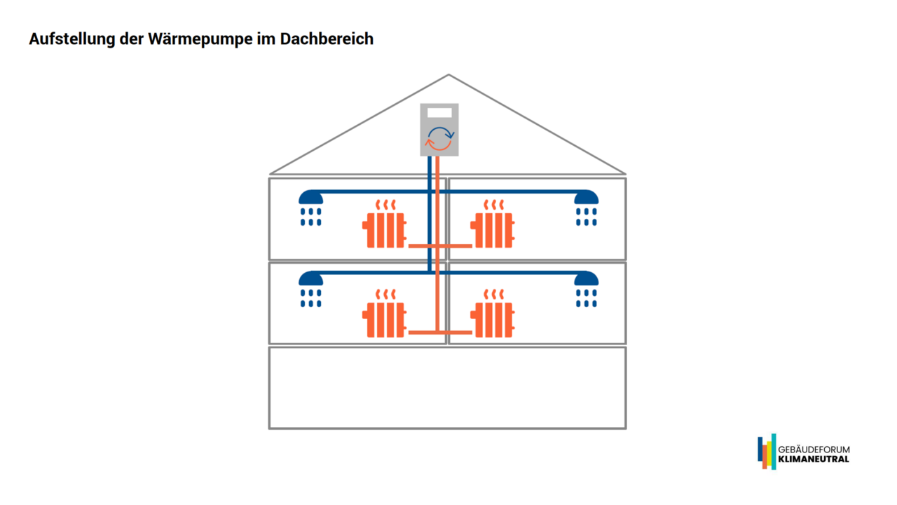 Die Aufstellung der Wärmepumpe im Dachbereich stellt höhere bauliche und schallschutztechnische Anforderungen als die zuvor genannten Varianten. Dies betrifft sowohl Maßnahmen zur Vermeidung der Körperschallübertragung als auch der Entwicklung und Verbreitung von Luftschall im Außenraum. Zudem ist die Statik des Gebäudes zu beachten. Die Entscheidung für die Art der Wärmepumpe (Monoblock oder Splitgerät) sowie für die Luftführung über Giebelseite und/oder Dachfläche sind von der konkreten baulichen Situation abhängig.