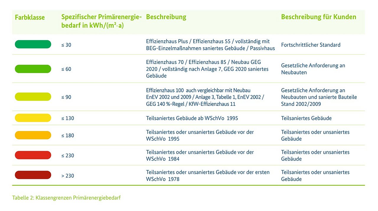 Klassengrenzen des Primärenergiebedarfs für das Gesamtgebäude