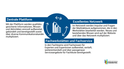 Das Gebäudeforum leistet einen Beitrag zur Erreichung der ambitionierten Klimaziele, indem es über drei Ansatzpunkte die Fortschritte und die Umsetzung der Energiewende im Gebäudebereich beschleunigt: